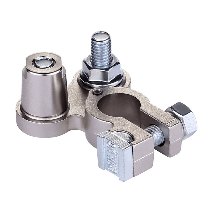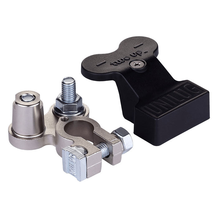 One of the main challenges encountered in a dual battery, winch or led light bar spot lights installation is finding a way to connect the extra leads to the starting battery. Often this can't done without cutting the factory leads – not always desirable. Unilug have come to the rescue with a very innovative solution – the 'Two Up' battery terminal lug. The unique design of the Two Up terminal includes a tapered adaptor that replicates the standard SAE post found on nearly all automotive batteries. The adaptor can be screwed on to either of the two studs provided, allowing the factory lead to be relocated without cutting. The second stud can then be used for connecting the auxiliary battery. Simple!