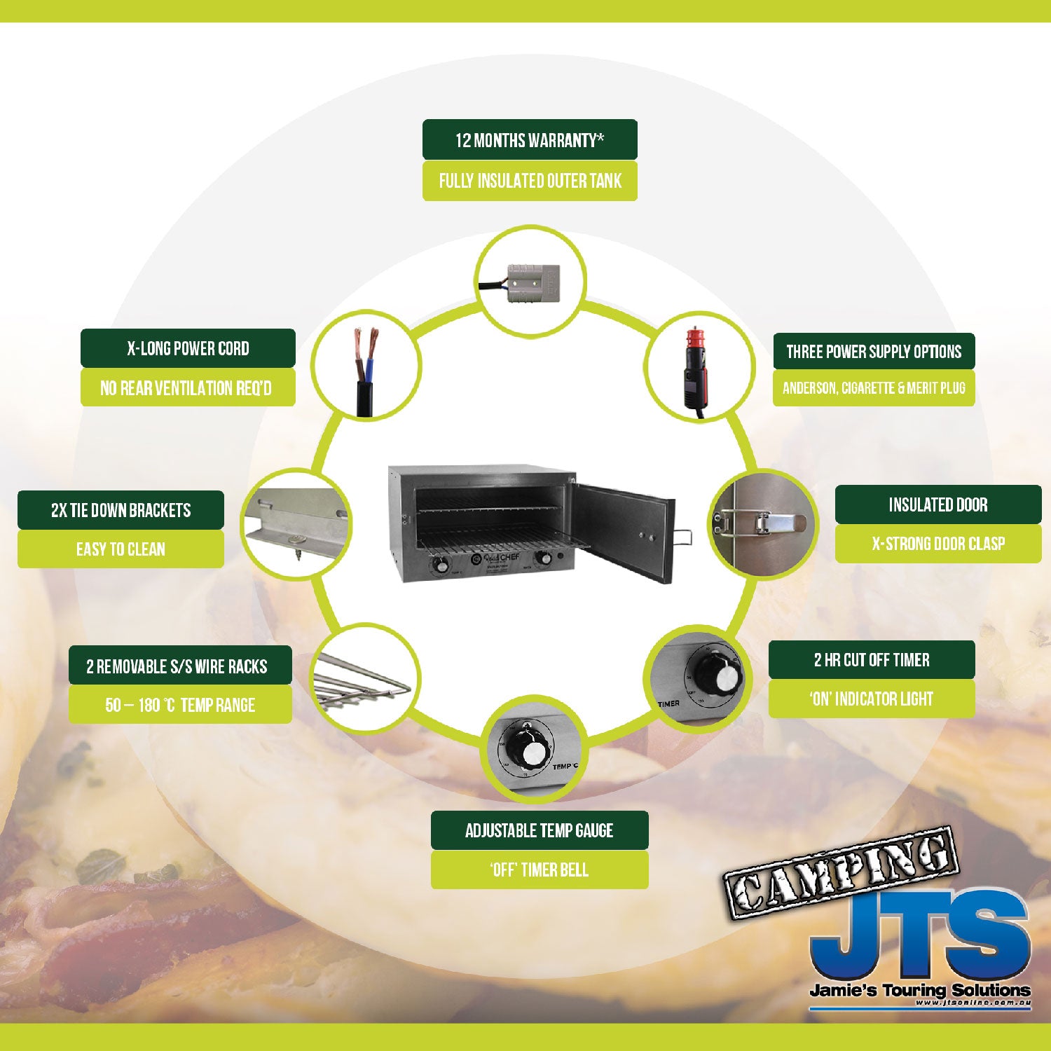 It’s a must-have addition to every camp kit. Enjoy 12 volt convenience of a compact gourmet oven wherever you may be trekking the Aussie great outdoors.